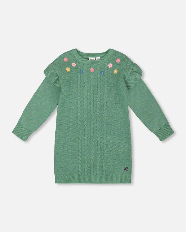 Deux Par Deux - Knitted Dress Iceberg Green With Ruffles And Floral Embroidery