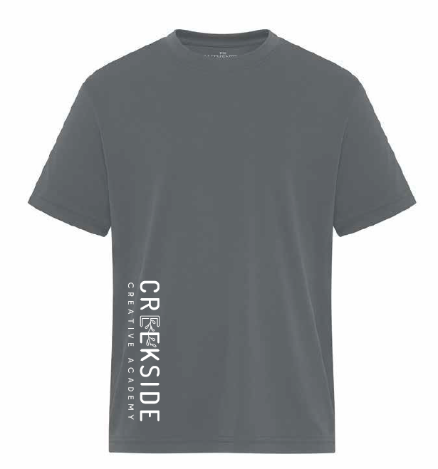 The Creekside Creative Academy Youth ATC Performance T-Shirt combines moisture-wicking fabric with a tailored fit designed to enhance mobility during activity. The advanced textile technology regulates body temperature while maintaining breathability.  Available in versatile grey and black to match any team kit or personal style.