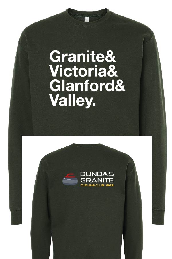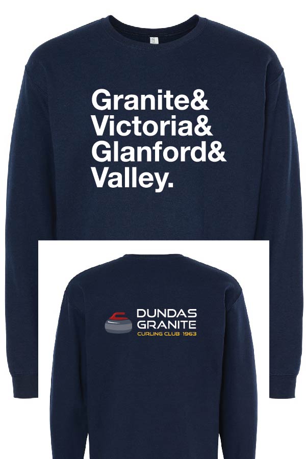 Represent your club with the Dundas Granite Curling Club Location Role Call Crewneck Sweatshirt. Featuring bold white vinyl lettering and the Curling Stone logo on the back. Choose from three sweatshirt colour options.