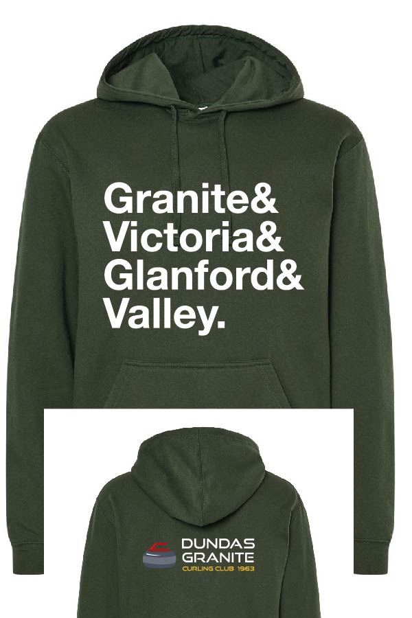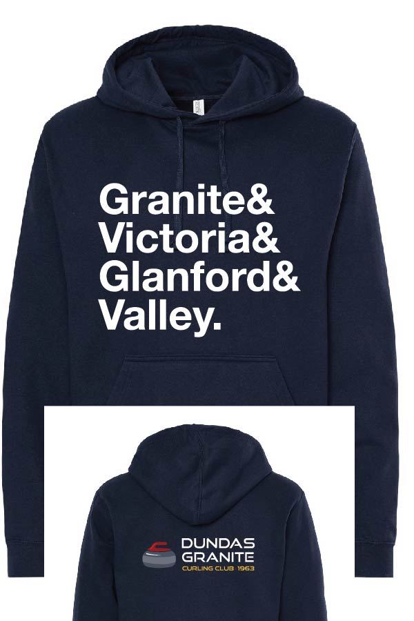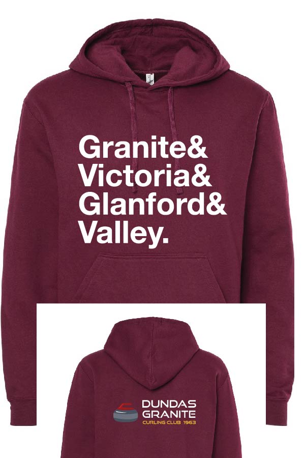 Represent your club with the Dundas Granite Curling Club Role Call Hoodie. Featuring bold white vinyl lettering and the Curling Stone logo on the back. Choose from four hoodie colour options.