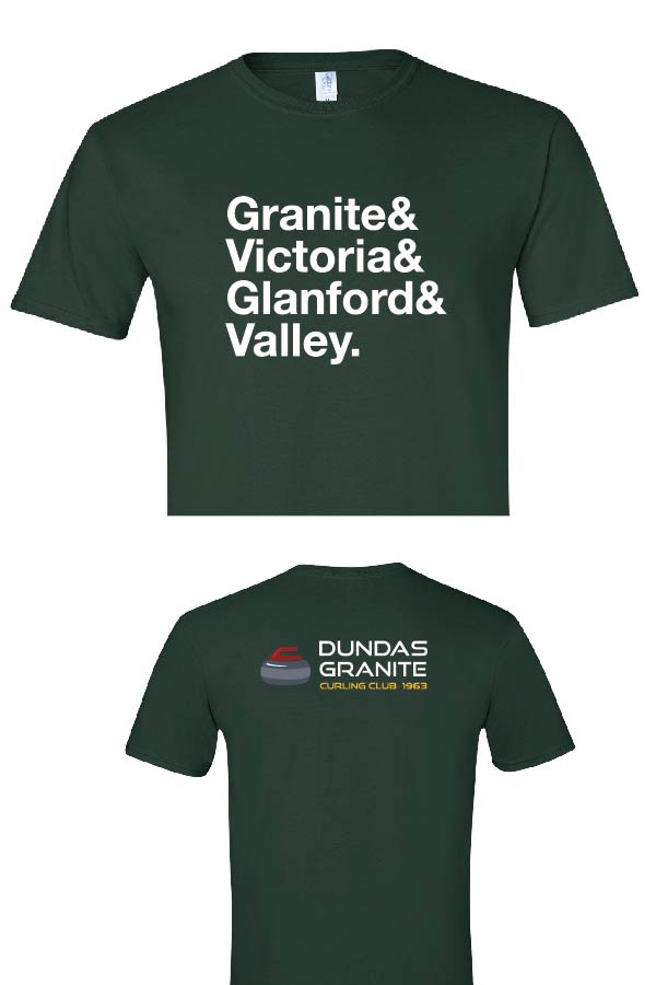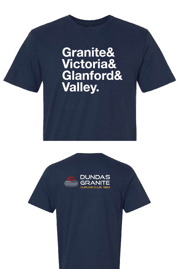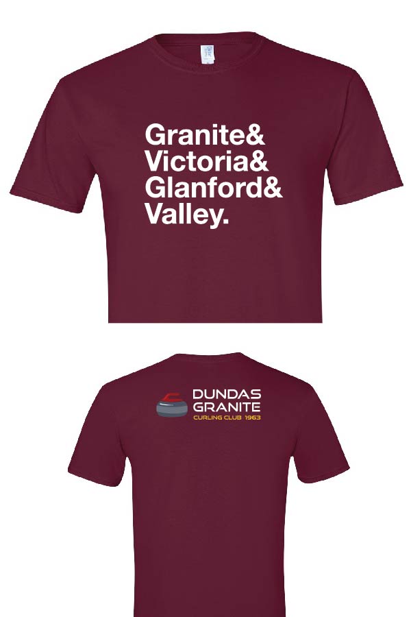 Represent your club with the Dundas Granite Curling Club Location Role Call T-Shirt. Featuring bold white vinyl lettering and the Curling Stone logo on the back. Choose from four t-shirt colour options.