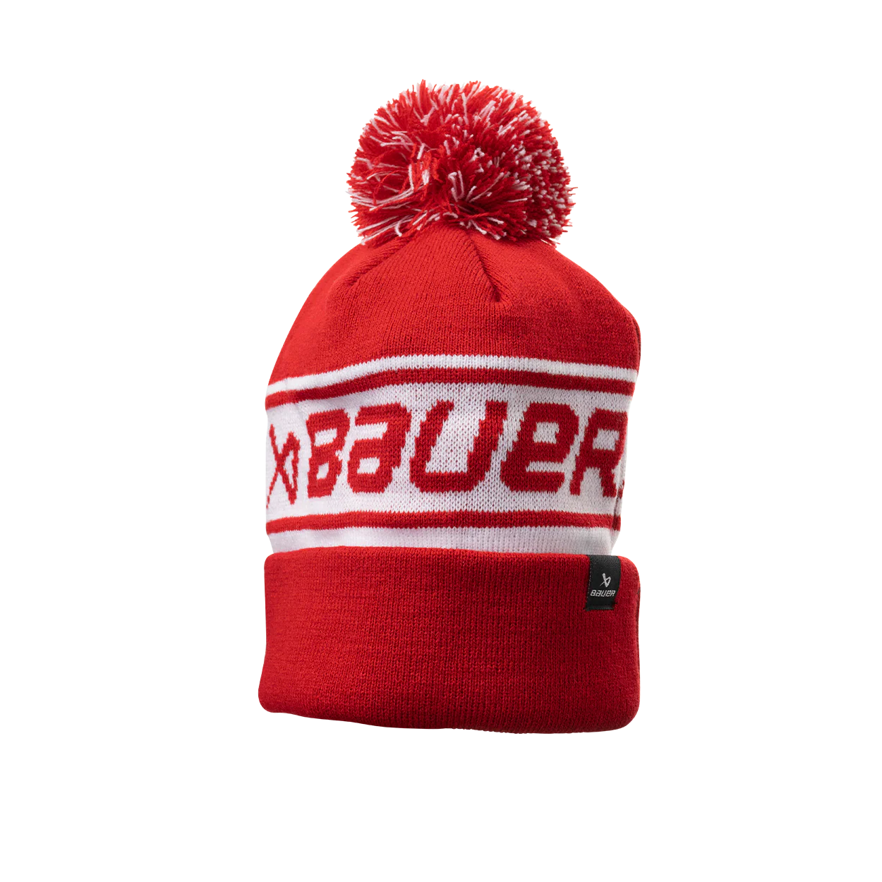 Bauer toque has the logo embroidered on the front cuff.  Toques are available in black and red.