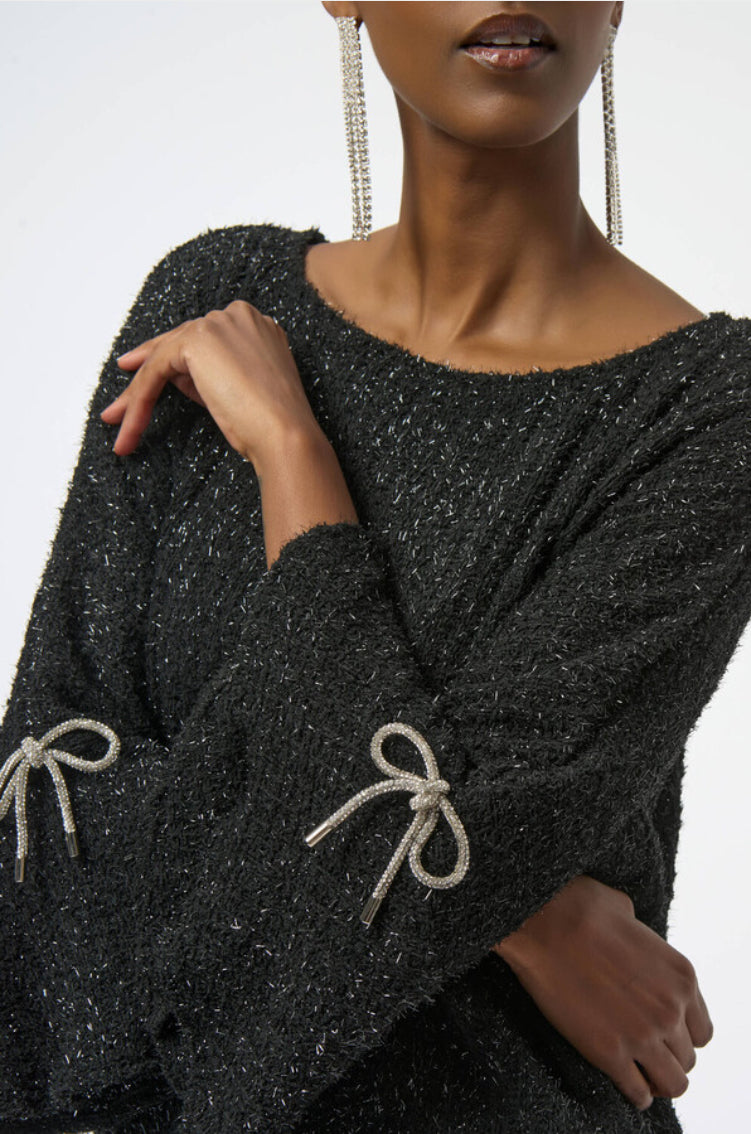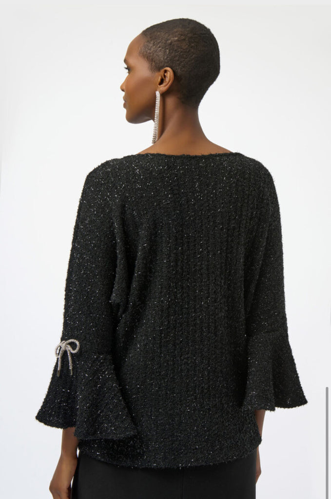 Introducing the Joseph Ribkoff pullover that seamlessly blends style and comfort. Designed with a relaxed fit and hip-length cut, this chic piece features jewel embellishments and bell sleeves for a touch of glamour. The boat neck and textured pattern add sophisticated details, making it perfect for evening, casual, or party occasions. Embrace the elegant, long-sleeve design for a truly fashionable look.