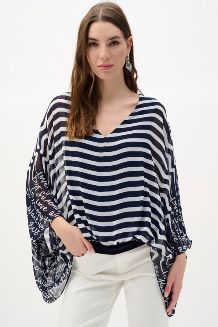 Introducing the Joseph Ribkoff pullover that combines comfort and style effortlessly. With its draped, lightweight fabric and loose fit, this hip-length top is perfect for casual summer days. The v-neckline and batwing long sleeves add a bohemian touch, while the striped and text-print patterns make it a standout piece. Ideal for laid-back occasions, this pullover is a must-have for your wardrobe.