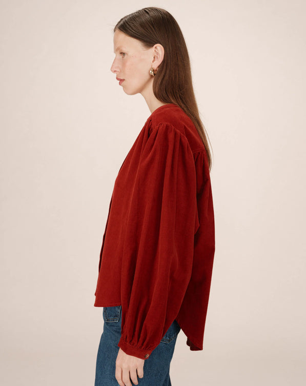The SURI oversized blouse is crafted from 100% cotton corduroy, blending comfort with a retro touch. The long puff sleeves with buttoned cuffs add soft volume to the silhouette. The SURI corduroy blouse features gathering at the shoulders and back yoke for an elegant play of textures.