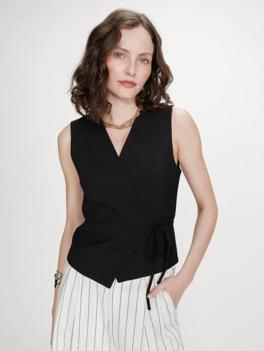 With its fitted cut and side tie closure, the VILMONT wrap vest is a feminine and chic piece. The design features faux welt pockets at the front and a cotton lining. The clean lines of the VILMONT wrap vest create a modern and minimalist silhouette