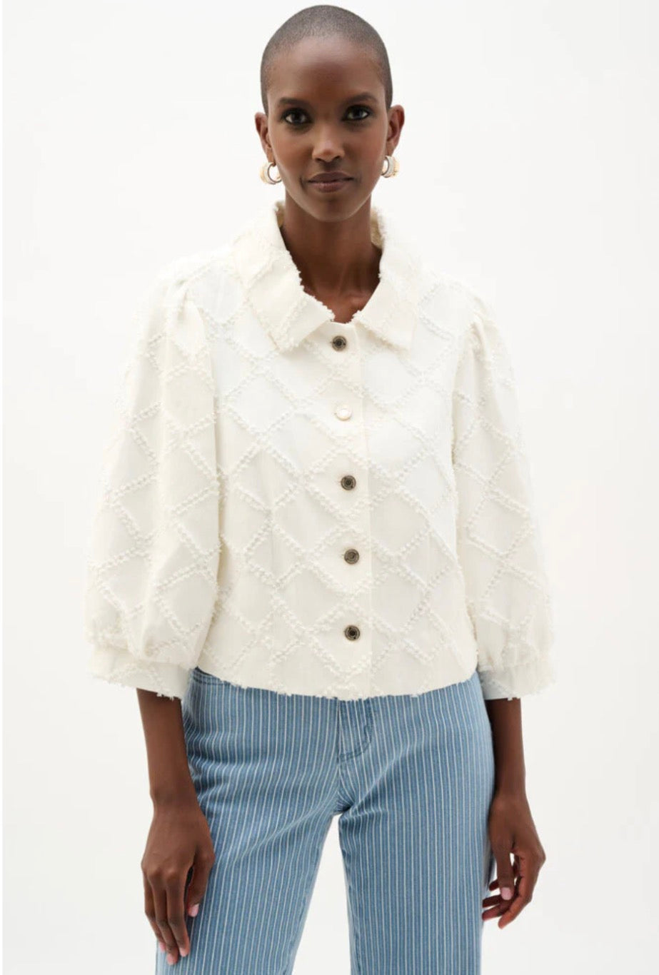 Crafted from cotton twill, this jacket blends structure with feminine detail. Designed with a crew neckline, three-quarter balloon sleeves with cuffs, and hidden side-seam pockets, it’s finished with a diamond pattern for subtle texture.