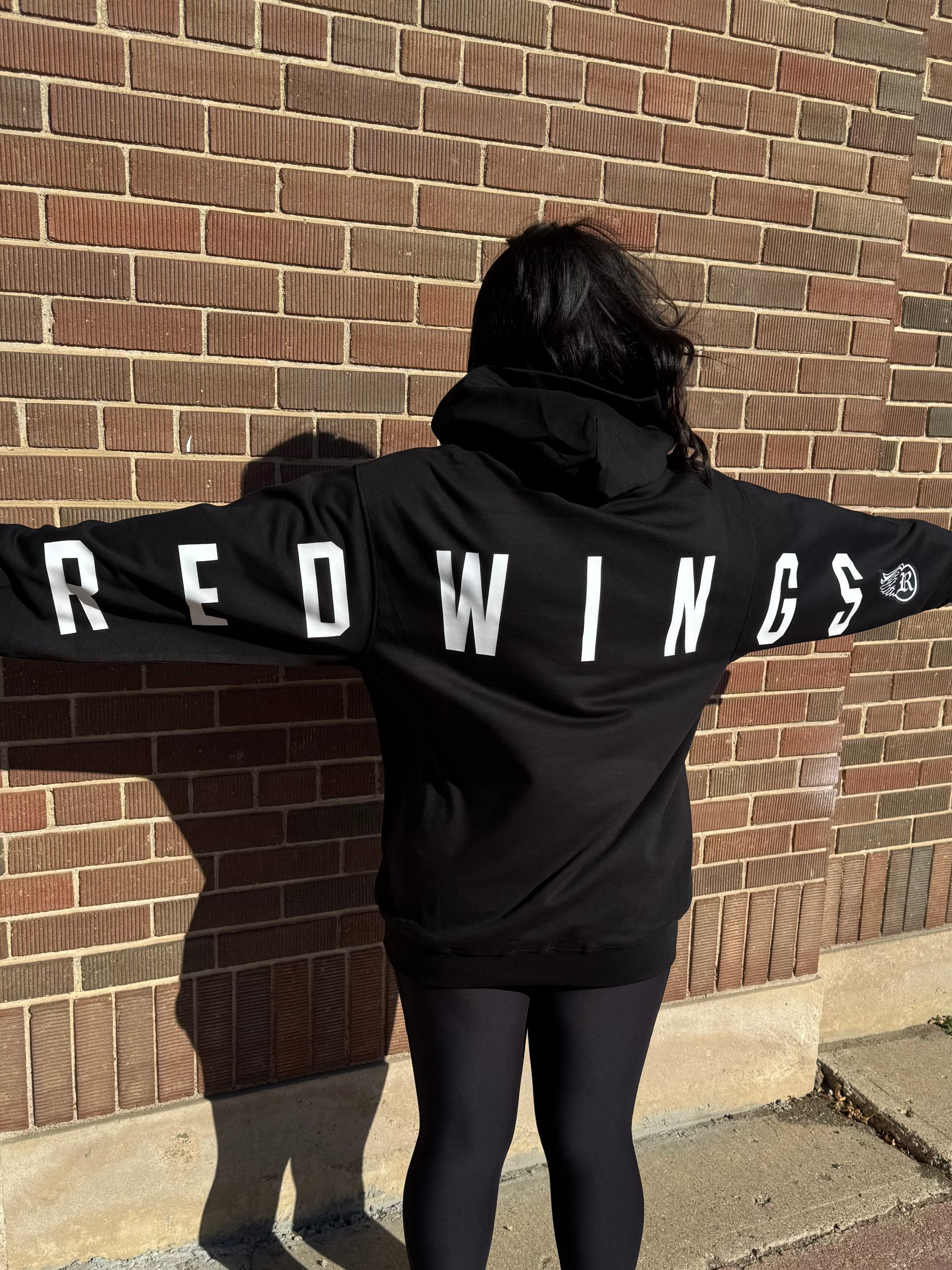 This soft hoodie features a large, bold "Redwings" lettering prominently displayed on the back, making a strong team statement. The front showcases a subtle, refined design that complements the varsity style without overpowering it. Crafted for comfort and style, it’s an ideal choice for supporters and players alike who appreciate understated front details paired with striking back graphics.