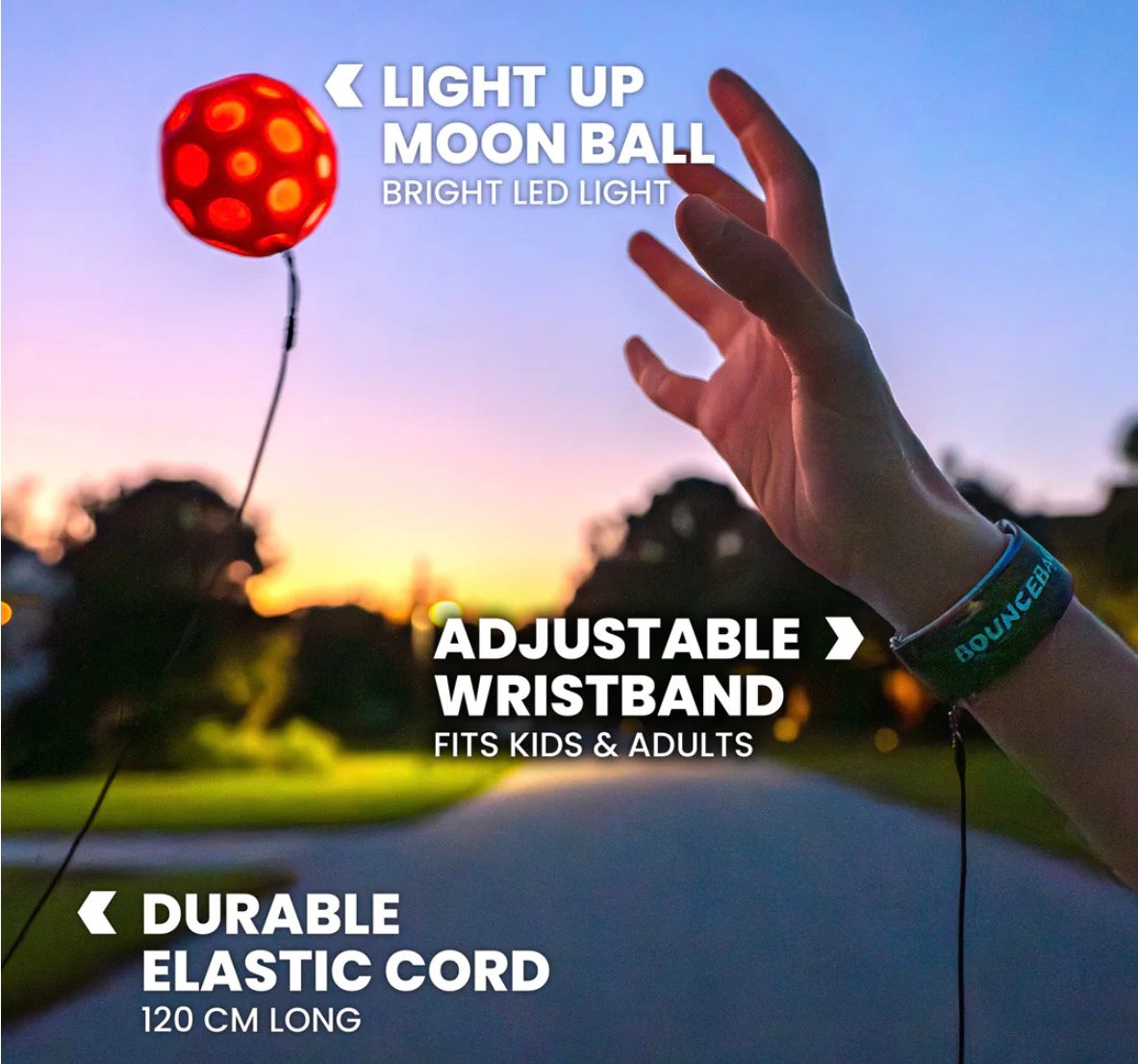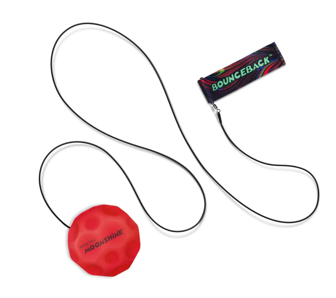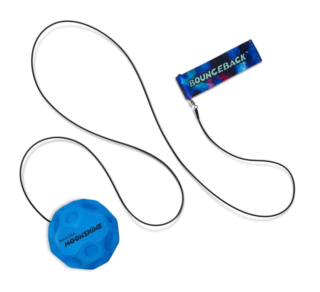 Bounceback after dark! Introducing the LED Bounceback: the new nighttime edition with a glowing Moonshine Ball on a leash. Catch it on the rebound! This light up Moon Ball shines bright wherever you play, indoors or outdoors, and guarantees you'll never lose a ball in the dark. Perfect for nighttime hangs, after-dark walks, or burning off those pre-bedtime energetic bursts.