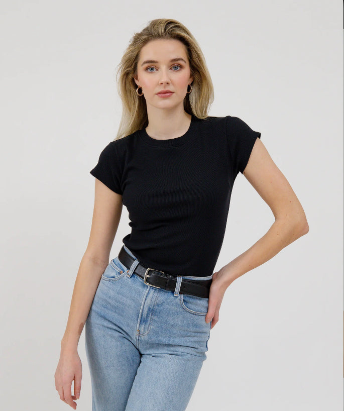 Discover the perfect blend of style and comfort with the Brunette the Label Rib Fitted Tee with Cap Sleeves. This tee is not just an ordinary top; it is designed for the modern woman who values both fashion and functionality.