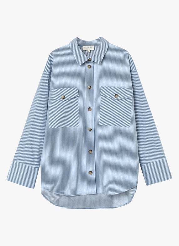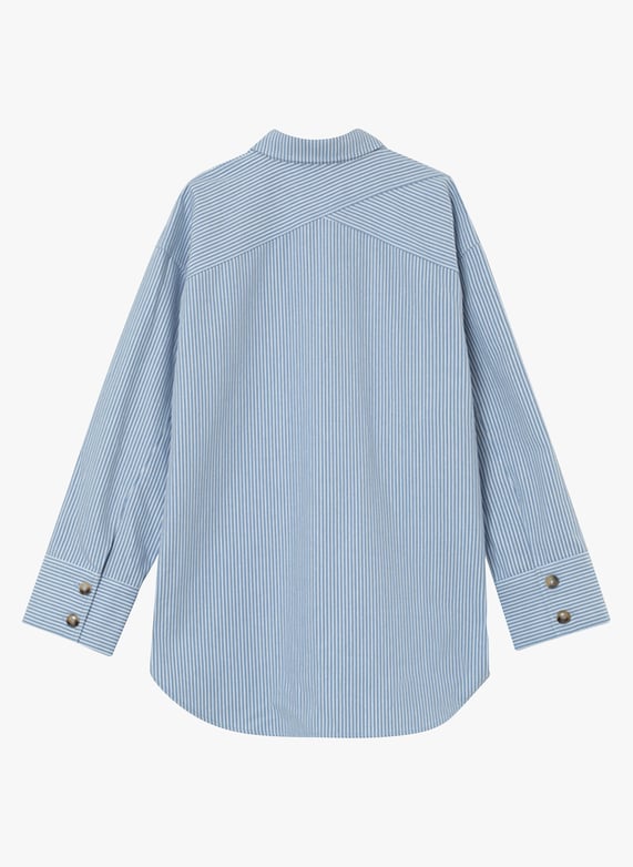 The PEGGY oversized shirt is made from a natural fiber fabric that gives it a relaxed yet structured style. The classic shirt collar, patch pockets with flaps, and the front button placket feature traditional shirt elements in an oversized cut. The detailed touches of the PEGGY striped shirt, such as the horn-effect buttons and the crossed yoke at the back, make it a refined and sophisticated piece.