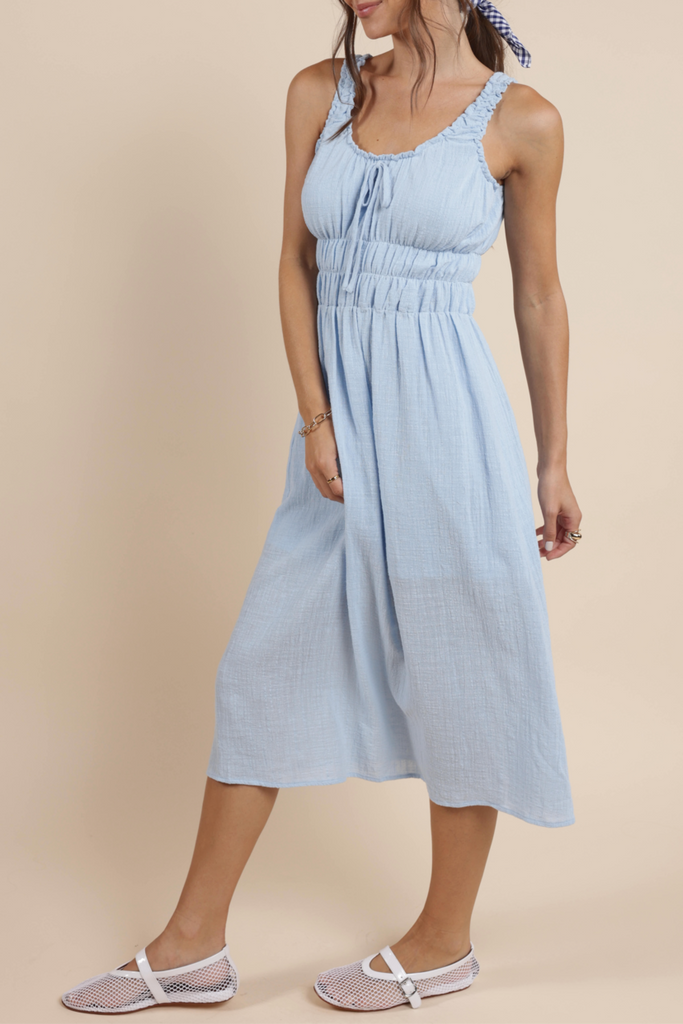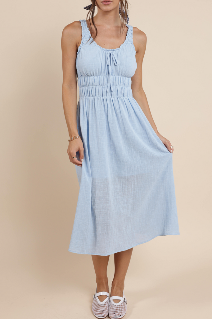 Transform your wardrobe with our elegant SCRUNCHY DETAIL MIDI DRESS! Crafted from a luxurious powder blue fabric, this midi dress features a unique scrunchy neckline for a chic and modern look. Perfect for any occasion, this dress will elevate your style and leave a lasting impression.