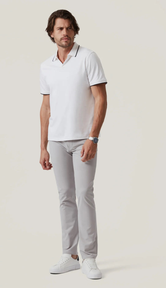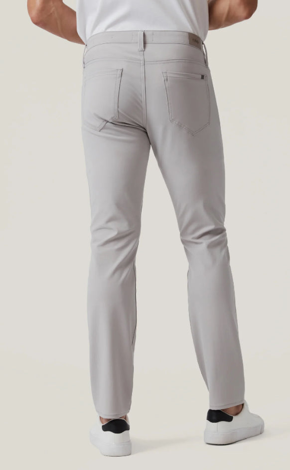 This streamlined tapered leg finishes in a polished grey hue. A versatile tech fabrication combines comfort with a polished, professional appearance, making it an ideal travel pant.