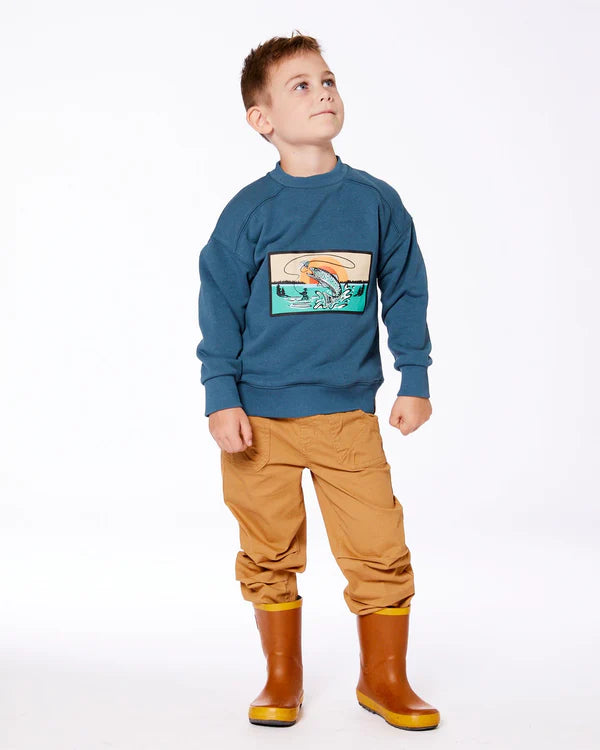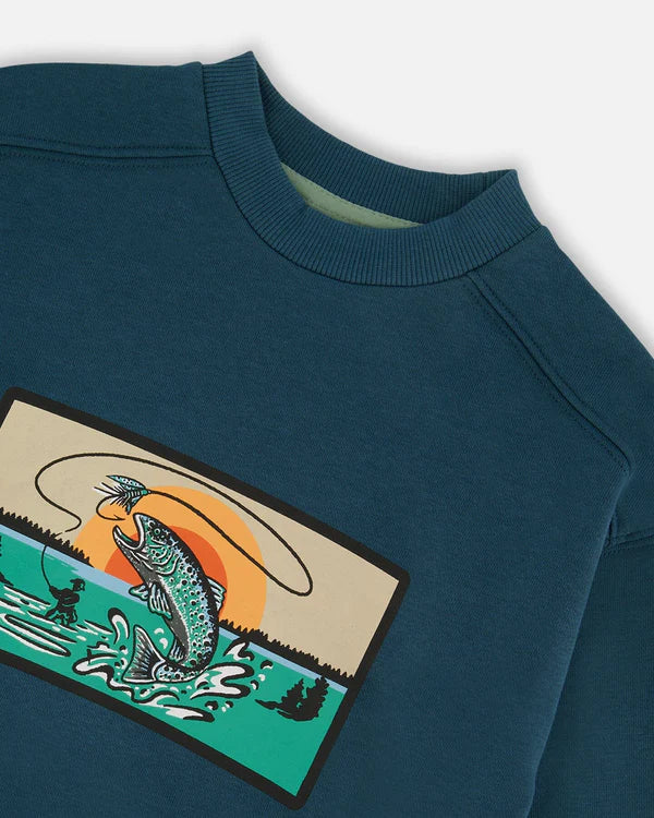Our Printed Pullover French Terry Sweatshirt Teal and Peach adds cozy comfort and playful style to any little boy's wardrobe. This adorable sweatshirt features a pullover silhouette with long sleeves, a crew neckline, an eye-catching fish print, and rib knit trim at the neck, cuffs, and hem.