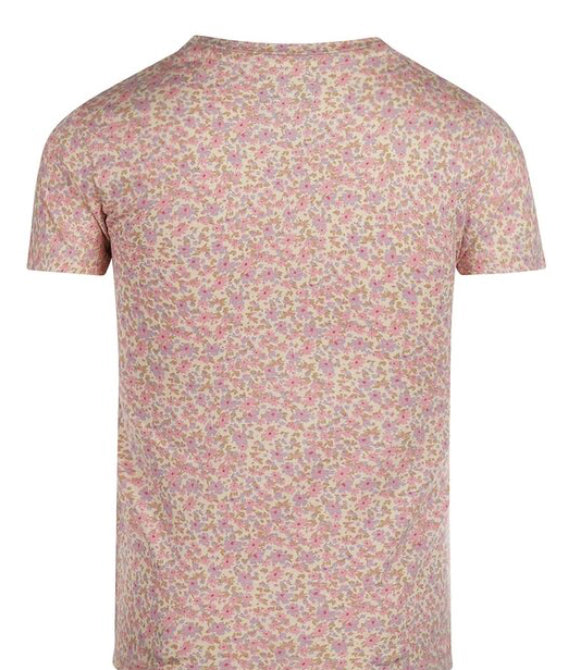 Keep smiling! The Koko Noko T-shirt is full of cheerful flowers in pink and lilac. The short-sleeved T-shirt is made of a soft cotton with stretch and sizes up to 12 feature poppers on the shoulder. The keep smiling application and the bow at the waist make this girls' shirt extra cute. A perfect combination with matching flared leggings or fine jeans from the Koko Noko collection.