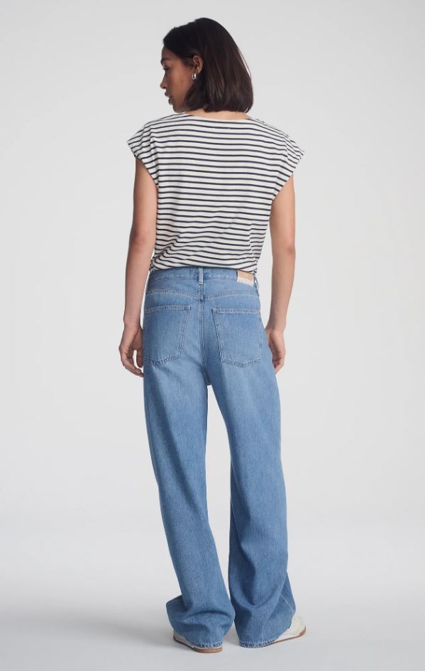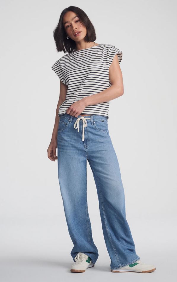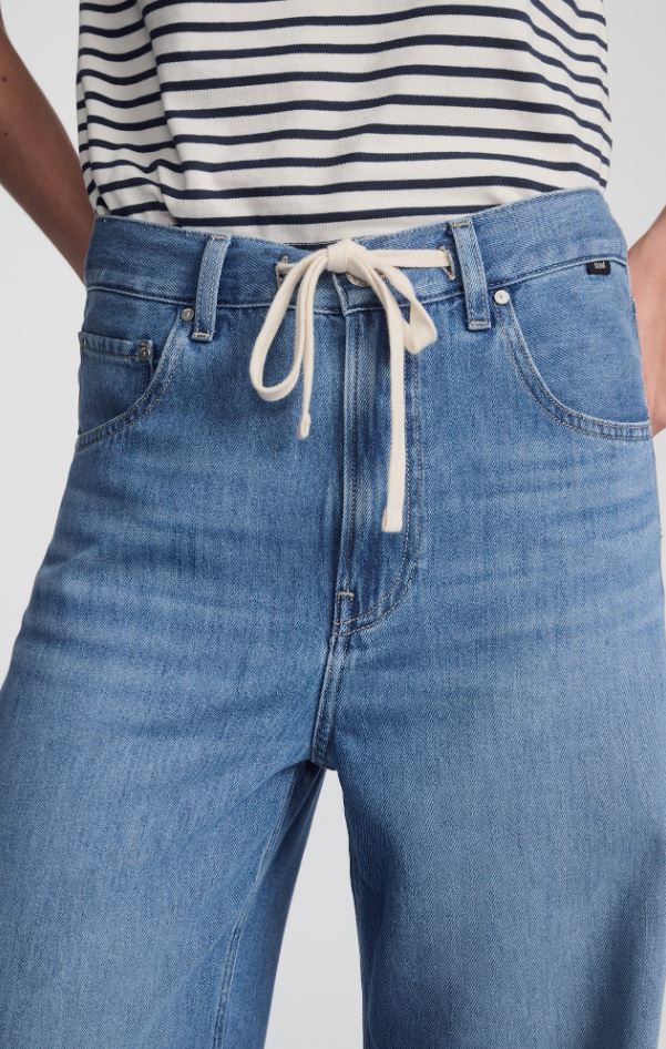 Nella features a loose wide leg and high rise, finished with an adjustable drawstring. Blending comfort with a bold look, it offers relaxed movement through the leg while keeping a defined waist. This pair comes in a versatile light blue wash with subtle whiskering.