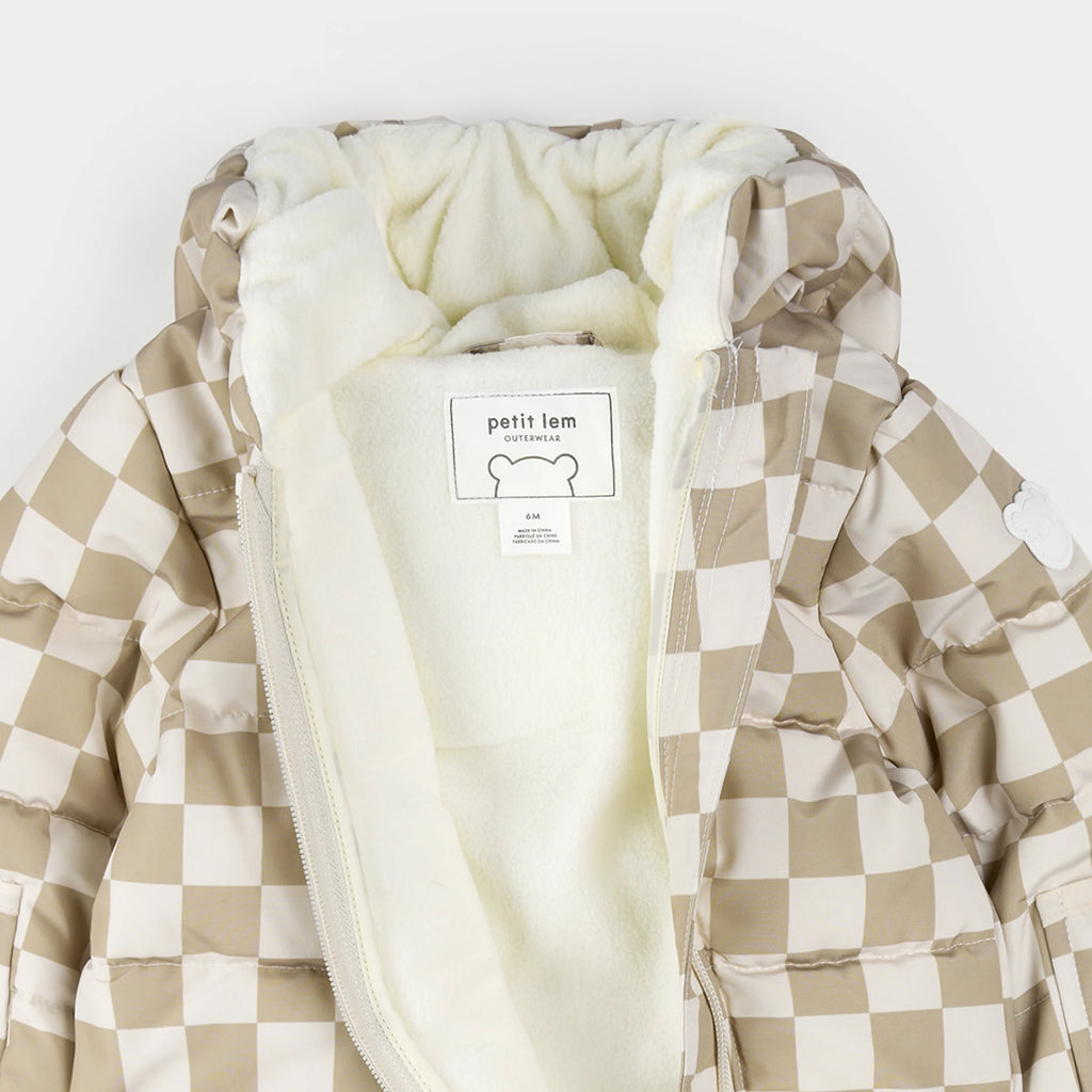 Keep him cozy while looking cool in this checkerboard printed snowsuit. Made from recycled materials, the one-piece is a sustainable choice for little ones who are eager to get out in the snow. Featuring a soft fleece lining, wind guard sleeves and a face-hugging hood, the snowsuit keeps him warm and dry while he dives, digs or sledges his way through the day. Ideal for colder climates and making heading into the wild weather that little bit more bearable.