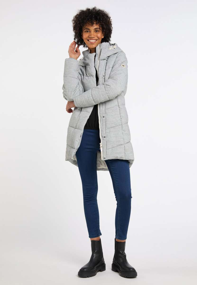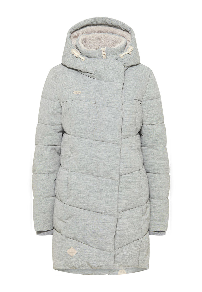 You will be stylishly dressed for winter with the warm PAVLA winter coat by ragwear It is thickly lined, quilted, comfortably cut and flared at the hem, and slightly longer at the back. Both the stand-up collar and the hood are lined with cosy sherpa fabric. The zip has an angled flap that adds something special to the coat. The design is complemented by side zip pockets and the typical logo appliqués.