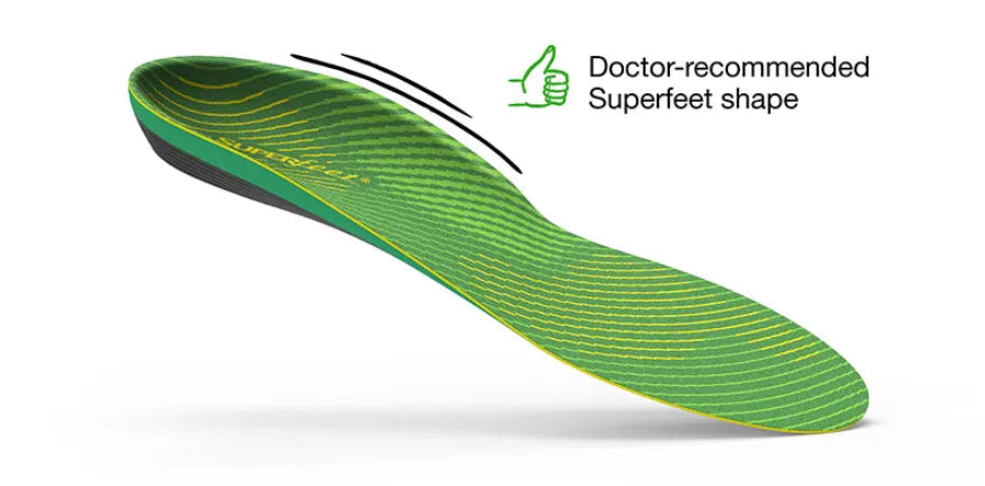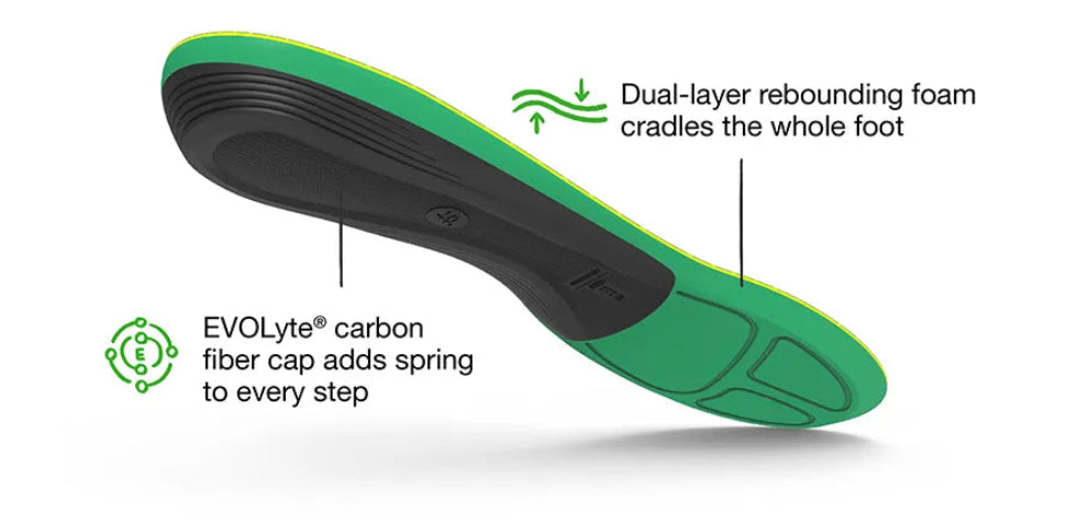 Superfeet Run Support High Arch insoles help runners reduce foot fatigue while gaining efficiency. The responsive EVOLyte® carbon fiber cap and two layers of AeroSpring™ Rebound foam combine to deliver exceptional comfort and smooth and efficient energy transfer through your gait from foot strike to toe off. Made to replace the removable liner in roomy to moderate-fitting running and walking shoes. Trim to fit your shoe size.